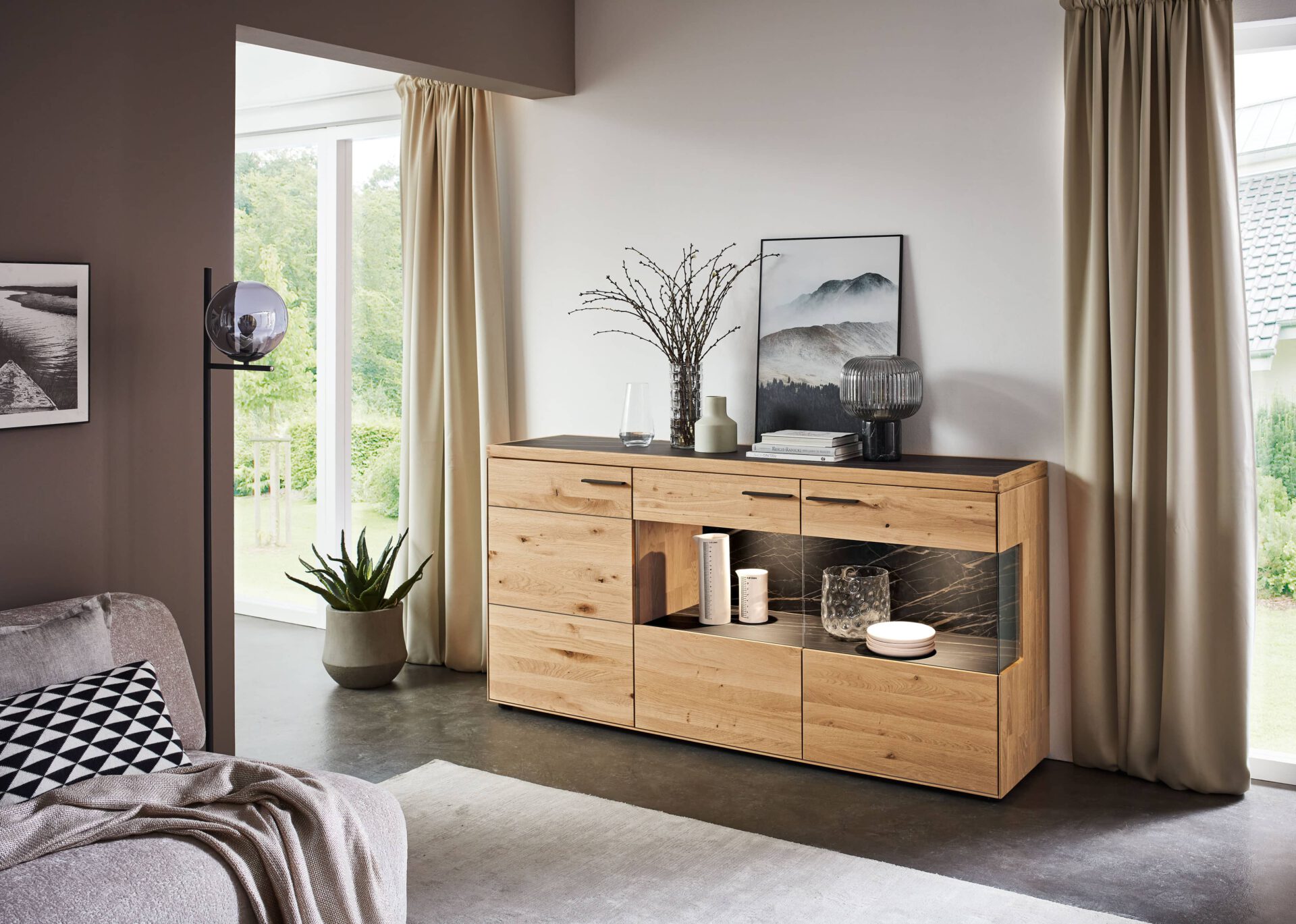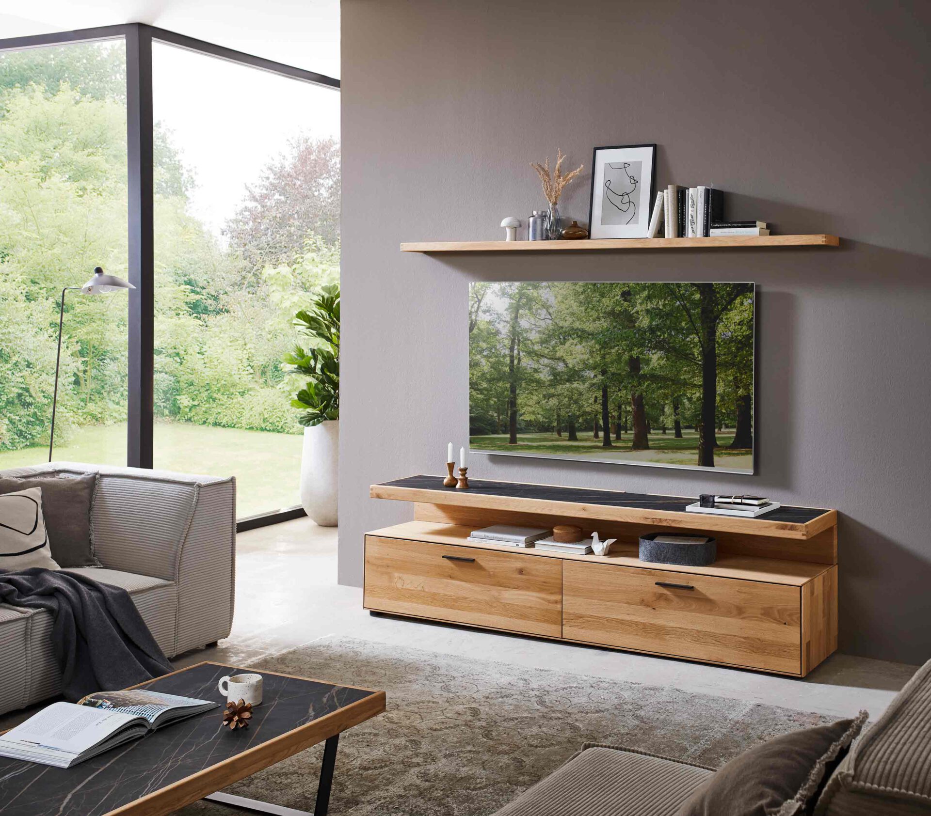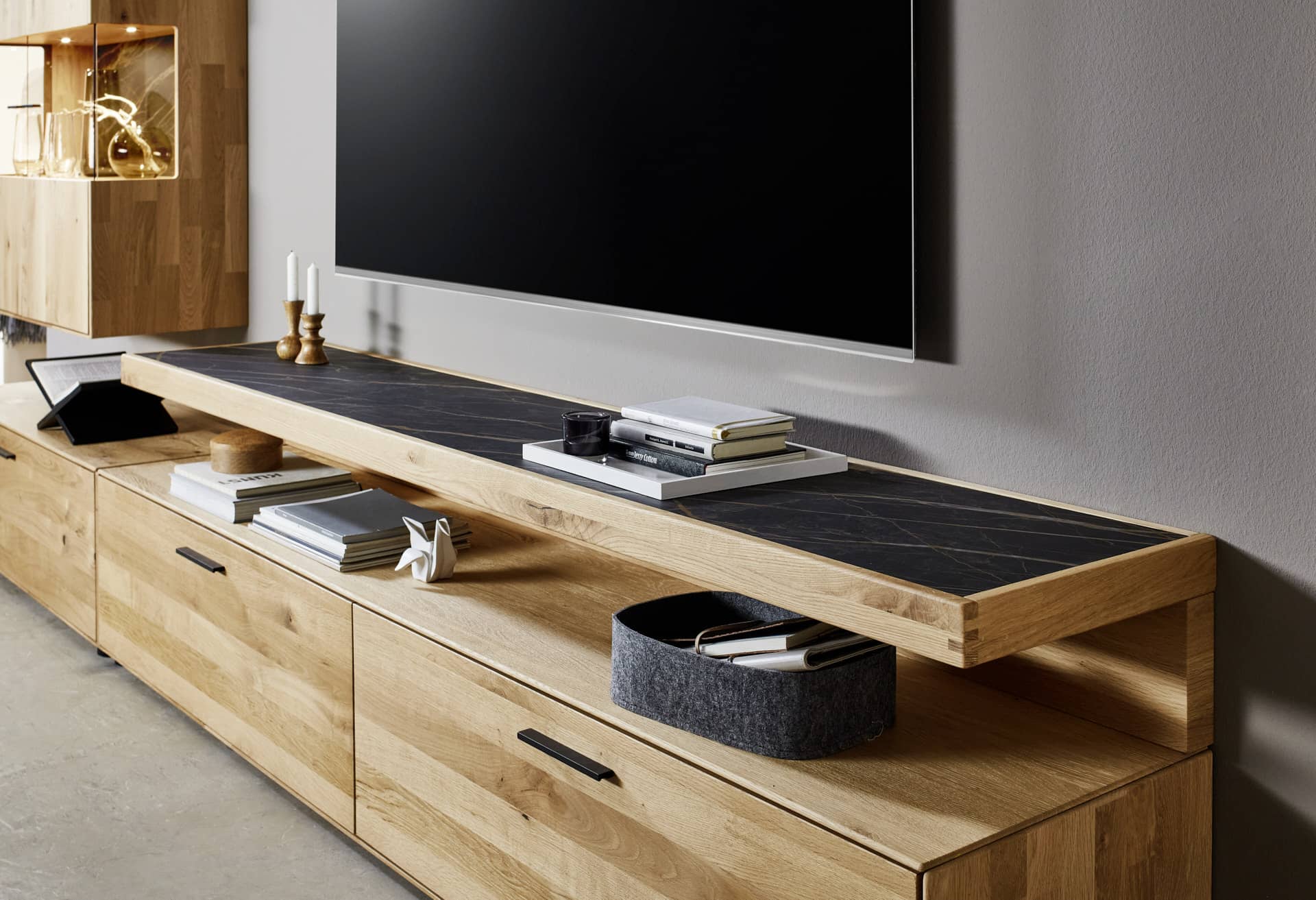 Die Living Unit WM 2520 überzeugt durch die Kombination aus gerahmten Keramikflächen und fein ausgearbeiteten Holzprofilen, die dem Möbelprogramm eine besondere Wertigkeit verleihen. Keramik findet sich dabei nicht nur auf den Fronten, sondern auch als Rückwand im Vitrinenbereich, was Tiefe und visuelle Spannung erzeugt. Klare Proportionen, hochwertige Materialien und präzise Verarbeitung sorgen für eine ruhige, elegante Präsenz im Raum. WM 2520 verbindet ästhetische Raffinesse mit Funktionalität und schafft eine Living Unit, die Struktur, Ordnung und eine zeitlose, wertige Ausstrahlung vereint.