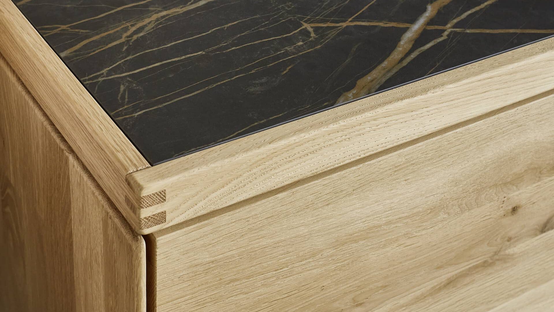Eine gerahmte Keramikfläche mit Holzprofilen besticht mit Wertigkeit. Ebenso der Einsatz von Keramik als Rückwand im Vitrinenbereich.